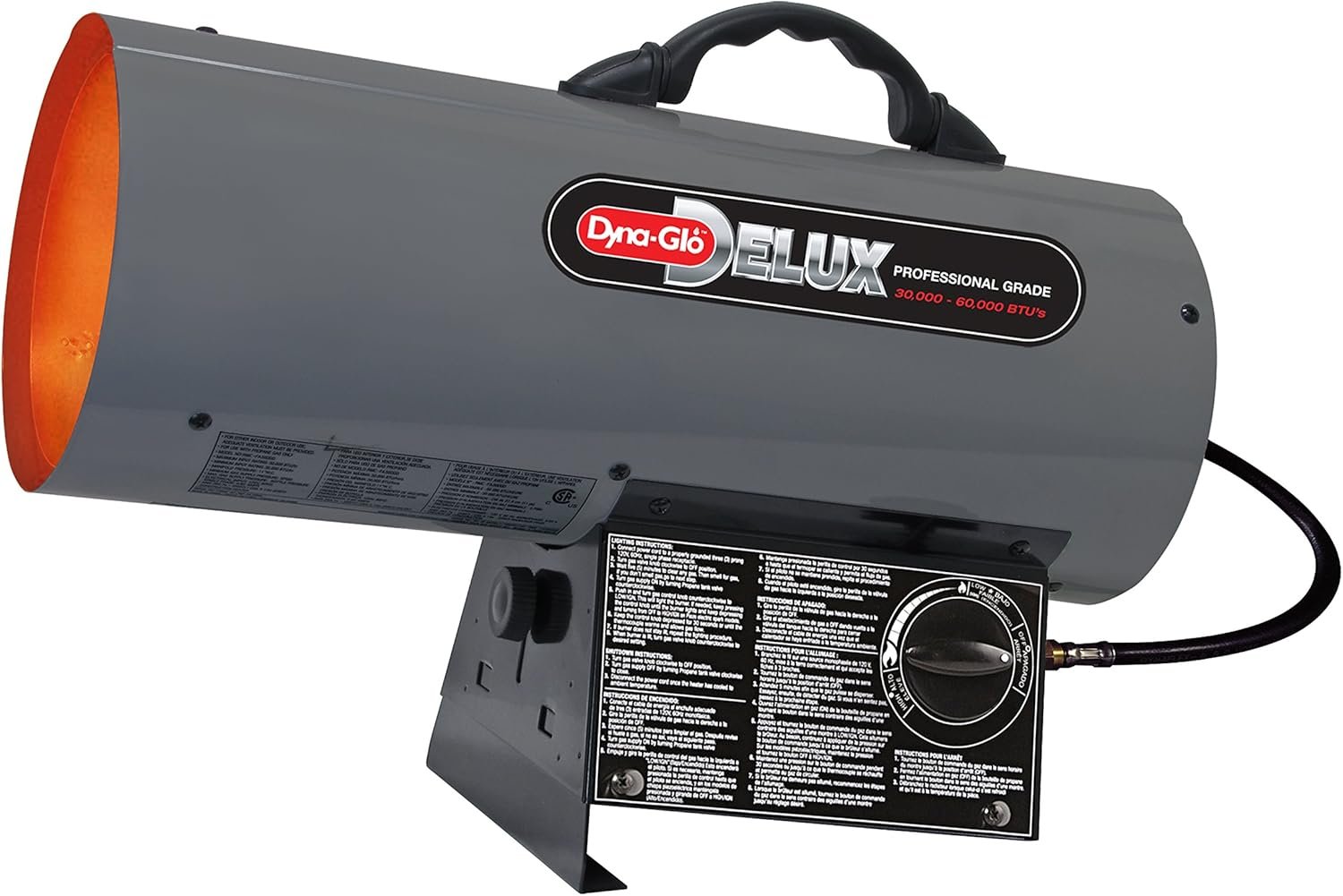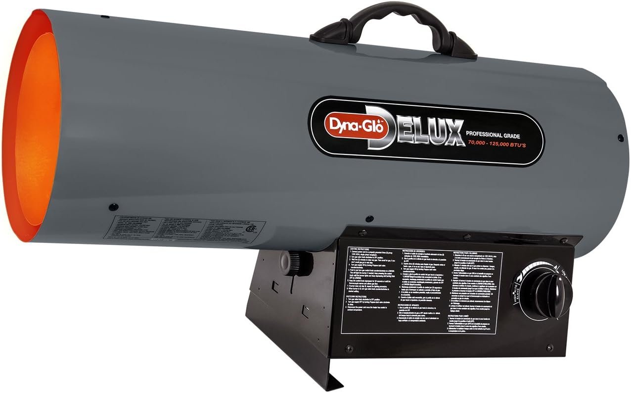 The Dyna-Glo Delux 40,000 BTU Forced Air Propane Portable Heateis ideal for outdoor/indoor construction, as well as industrial & commercial applications, making it an excellent choice for your portable heating needs. It features 1-hand piezo electric ignition, adjustable heat angle options, and and an easy lift handlel. It’s portable and offers a 40,000 BTU maximum capacity, sufficient to heat an area up to 1,000 sq. ft. It was designed with automatic overheat shutoff protection and is CSA-listed for safety. Hose and regulator assembly are included (LP tank sold separately). Adjustable Heat Angle Continuous Electronic Igntion Overheat Auto Shut-off Protection Includes 10′ Hose & Regulator Sturdy, Rugged Construction