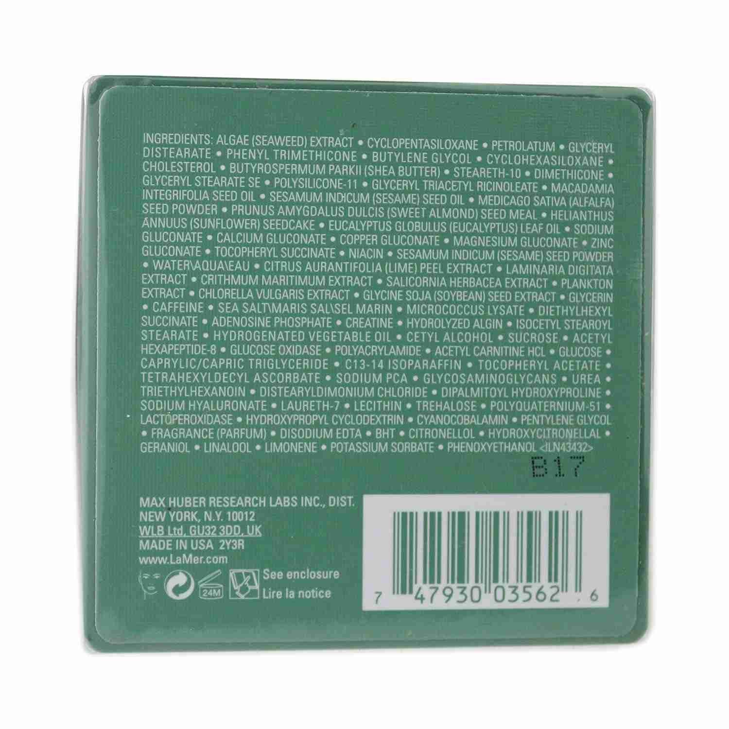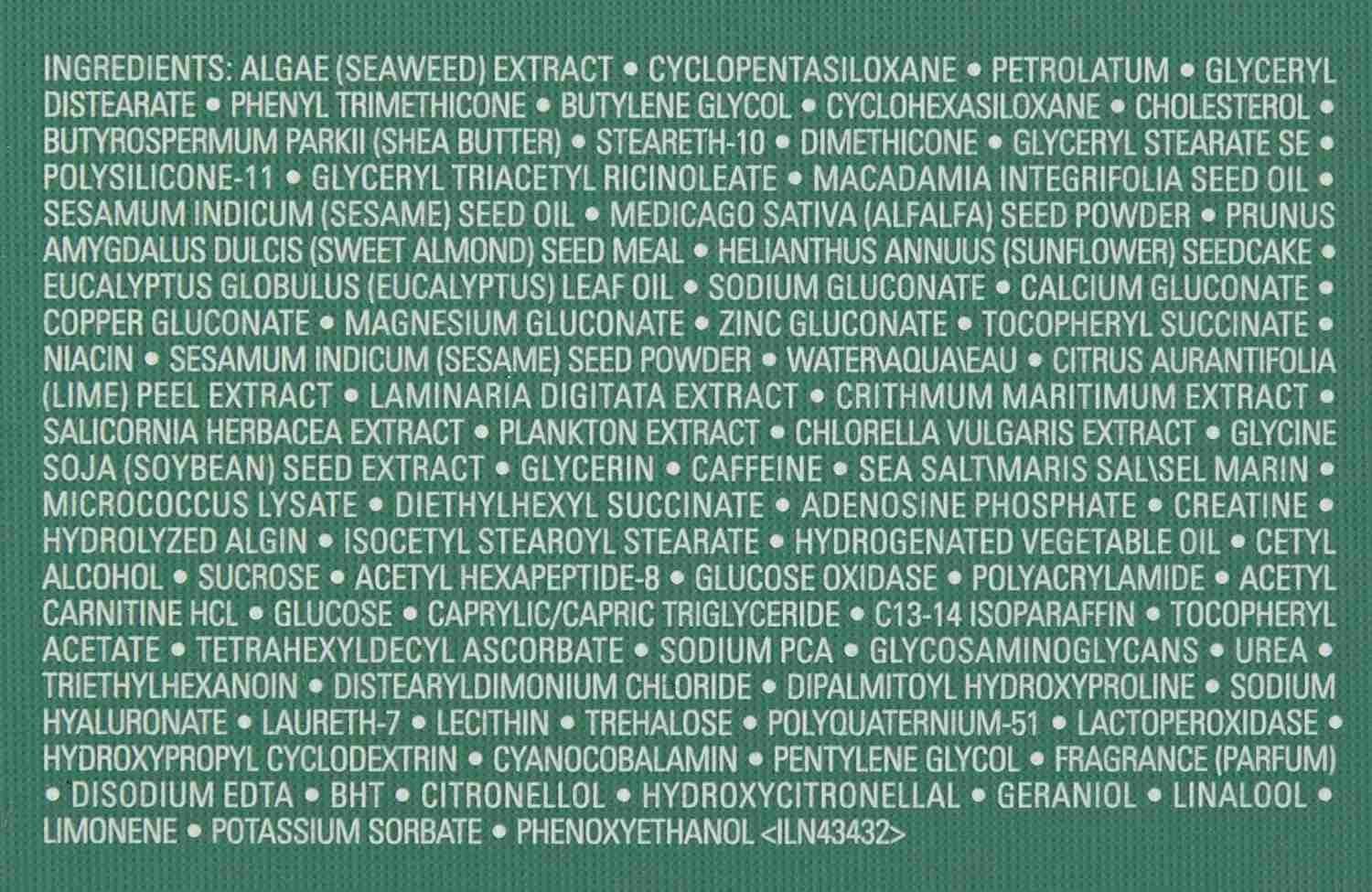 Algae Extract, Cyclopentasiloxane, Petrolatum, Glyceryl Distearate, Phenyl Trimethicone, Cyclohexasiloxane, Butylene Glycol, Cholesterol, Butyrospermum Parkii (Shea) Butter, Steareth-10, Dimethicone, Glyceryl Stearate Se, Polysilicone-11, Glyceryl Triacetyl Ricinoleate, Macadamia Integrifolia Seed Oil, Glycerin, Sesamum Indicum (Sesame) Seed Oil, Medicago Sativa (Alfalfa) Seed Powder, Helianthus Annuus (Sunflower) Seedcake, Prunus Amygdalus Dulcis (Sweet Almond) Seed Meal, Eucalyptus Globulus (Eucalyptus) Leaf Oil, Sodium Gluconate, Copper Gluconate, Calcium Gluconate, Magnesium Gluconate, Zinc Gluconate, Tocopheryl Succinate, Niacin, Sesamum Indicum (Sesame) Seed Powder, WaterAquaEau, Citrus Aurantifolia (Lime) Peel Extract, Laminaria Digitata Extract, Crithmum Maritimum Extract, Salicornia Herbacea Extract, Plankton Extract, Chlorella Vulgaris Extract, Rosmarinus Officinalis (Rosemary) Leaf Extract, Sodium Hyaluronate, Tocopheryl Acetate, Acetyl Hexapeptide-8, Caffeine, Tetrahexyldecyl Ascorbate, Palmitoyl Hexapeptide-12, Caprylic/Capric Triglyceride, Triethylhexanoin, Sodium Pca, Cetyl Alcohol, Diethylhexyl Succinate, Isocetyl Stearoyl Stearate, Cyanocobalamin, C13-14 Isoparaffin, Distearyldimonium Chloride, Dipalmitoyl Hydroxyproline, Sucrose, Hydrogenated Vegetable Oil, Trehalose, Hydrolyzed Algin, Micrococcus Lysate, Sea SaltMaris SalSel Marin, Tetradecyl Aminobutyroylvalylaminobutyric Urea Trifluoroacetate, Lactoperoxidase, Glucose Oxidase, Urea, Glucose, Polyacrylamide, Glyceryl Polymethacrylate, Peg-8, Laureth-7, Lecithin, Triacetin, Sodium Chloride, Polyquaternium-51, Potassium Phosphate, Alcohol Denat., Fragrance (Parfum), Limonene, Linalool, Hydroxycitronellal, Citronellol, Geraniol, Bht, Disodium Edta, Sorbic Acid, Chlorphenesin, Potassium Sorbate, Phenoxyethanol