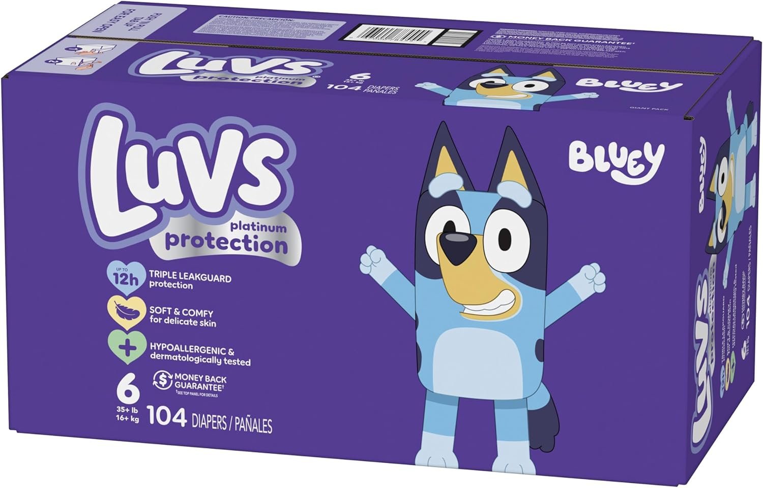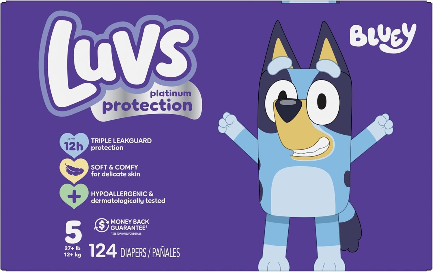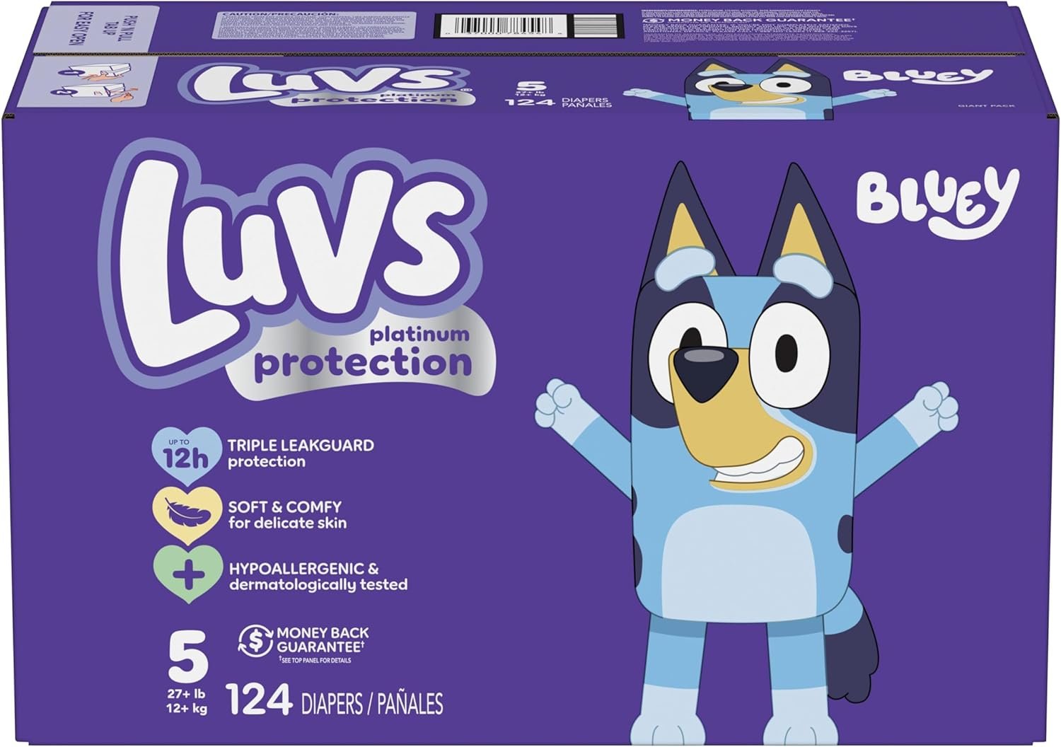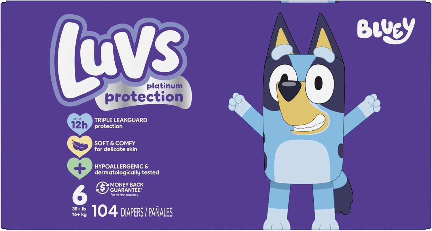 Introducing Luvs Platinum Protection diapers featuring Bluey! Luvs disposable diapers have up to 12-hours of Triple Leakguard Protection, but our leak protection doesn’t stop there, the secure cuffs and stretchy sides keep leaks locked in where they happen the most. Feel the softness and bring a new level of comfort for baby’s delicate skin. Parenting can be stressful. Rest assured with worry-free Luvs Diapers and give your baby the gentle comfort he/she needs with the name brand protection that parents trust. With Luvs Platinum Protection diapers you know when they go, thanks to a wetness indicator that turns blue on contact with wetness. Plus, meet our best friend, Bluey. These adorably fun patterns give these diapers an added layer of cuteness to match your baby. Here are the highlights: Four levels of protection: Triple Leakguards, wetness indicator, secure and stretchy sides, comfy leak barrier cuffs Max softness: Soft and comfy for your baby’s delicate skin It’s not a mystery that babies are pretty delicate, so these diapers are dermatologically tested, hypoallergenic, and free of parabens and latex.** Any fuss? Trust us with our money back guarantee. We think you’ll be wondering how you ever got by without these baby diapers, but if you’re not loving Luvs for any reason, we’ll send you a refund***. Luvs Platinum Protection Baby Diapers are available in sizes N-8. Size newborn (<10 lb), size 1 (8-14lb), size 2 (12-18 lb), size 3 (16-28 lb), size 4 (22-37 lb), size 5 (27+ lb), size 6 (35+ lb), and size 7 (41+ lb), size 8 (46+ lb). *vs. Base Luvs. ** No Natural rubber. ***If you’re not completely satisfied, please send the original receipt and UPC to us within 45 days of purchase for a full product refund via prepaid card. Limited to one redemption per household or name. For additional details, please call 1-888-665-3257.