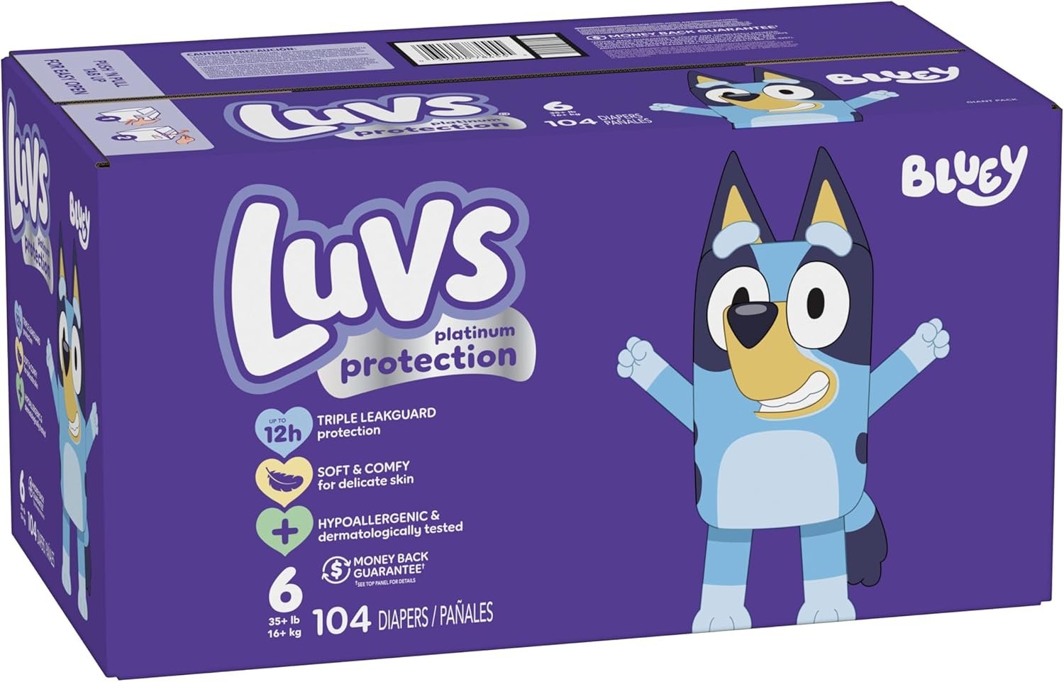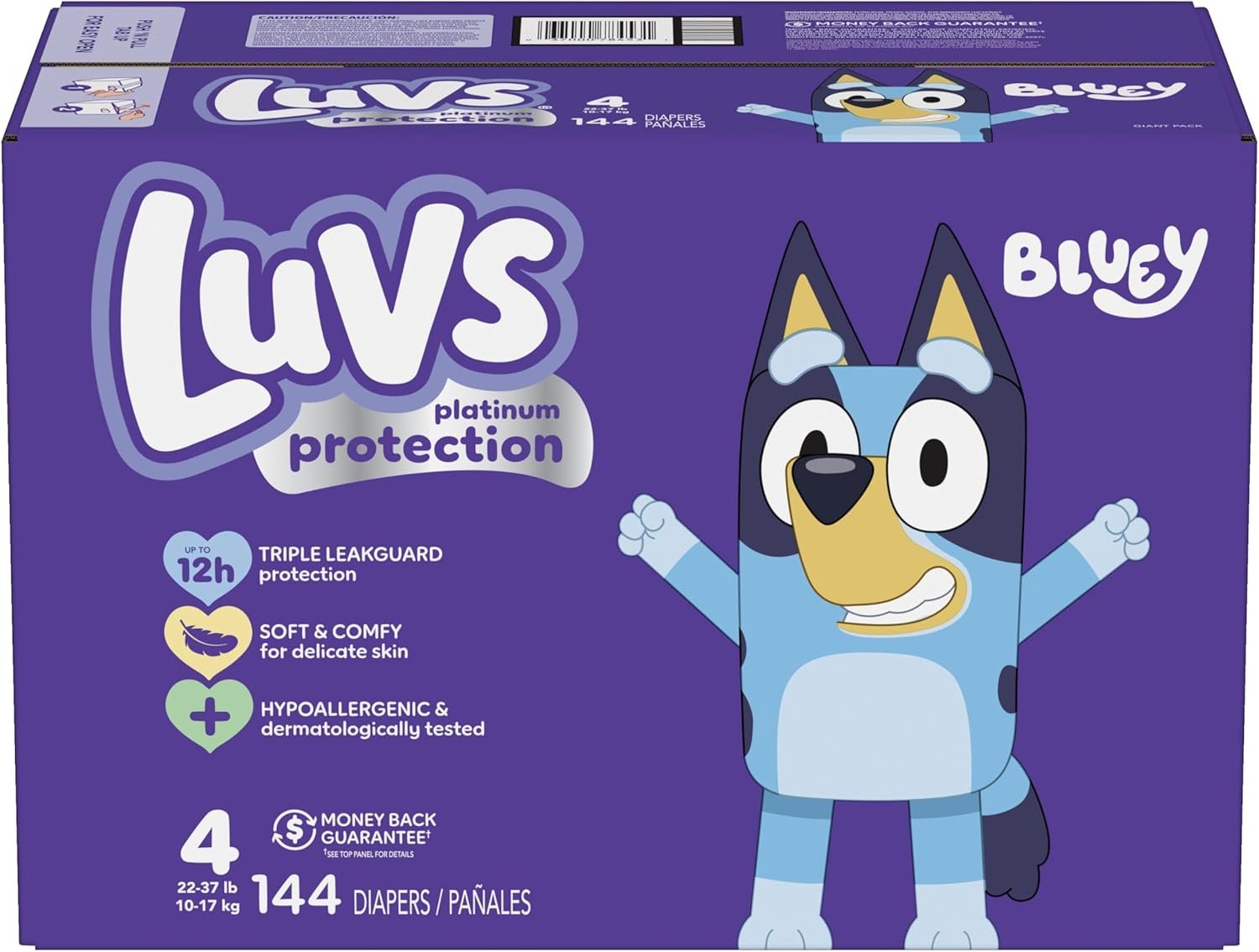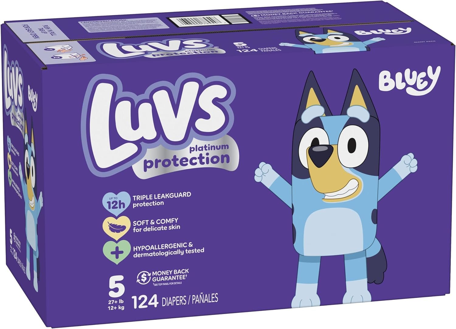 Introducing Luvs Platinum Protection diapers featuring Bluey! Luvs disposable diapers have up to 12-hours of Triple Leakguard Protection, but our leak protection doesn’t stop there, the secure cuffs and stretchy sides keep leaks locked in where they happen the most. Feel the softness and bring a new level of comfort for baby’s delicate skin. Parenting can be stressful. Rest assured with worry-free Luvs Diapers and give your baby the gentle comfort he/she needs with the name brand protection that parents trust. With Luvs Platinum Protection diapers you know when they go, thanks to a wetness indicator that turns blue on contact with wetness. Plus, meet our best friend, Bluey. These adorably fun patterns give these diapers an added layer of cuteness to match your baby. Here are the highlights: Four levels of protection: Triple Leakguards, wetness indicator, secure and stretchy sides, comfy leak barrier cuffs Max softness: Soft and comfy for your baby’s delicate skin It’s not a mystery that babies are pretty delicate, so these diapers are dermatologically tested, hypoallergenic, and free of parabens and latex.** Any fuss? Trust us with our money back guarantee. We think you’ll be wondering how you ever got by without these baby diapers, but if you’re not loving Luvs for any reason, we’ll send you a refund***. Luvs Platinum Protection Baby Diapers are available in sizes N-8. Size newborn (<10 lb), size 1 (8-14lb), size 2 (12-18 lb), size 3 (16-28 lb), size 4 (22-37 lb), size 5 (27+ lb), size 6 (35+ lb), and size 7 (41+ lb), size 8 (46+ lb). *vs. Base Luvs. ** No Natural rubber. ***If you’re not completely satisfied, please send the original receipt and UPC to us within 45 days of purchase for a full product refund via prepaid card. Limited to one redemption per household or name. For additional details, please call 1-888-665-3257.