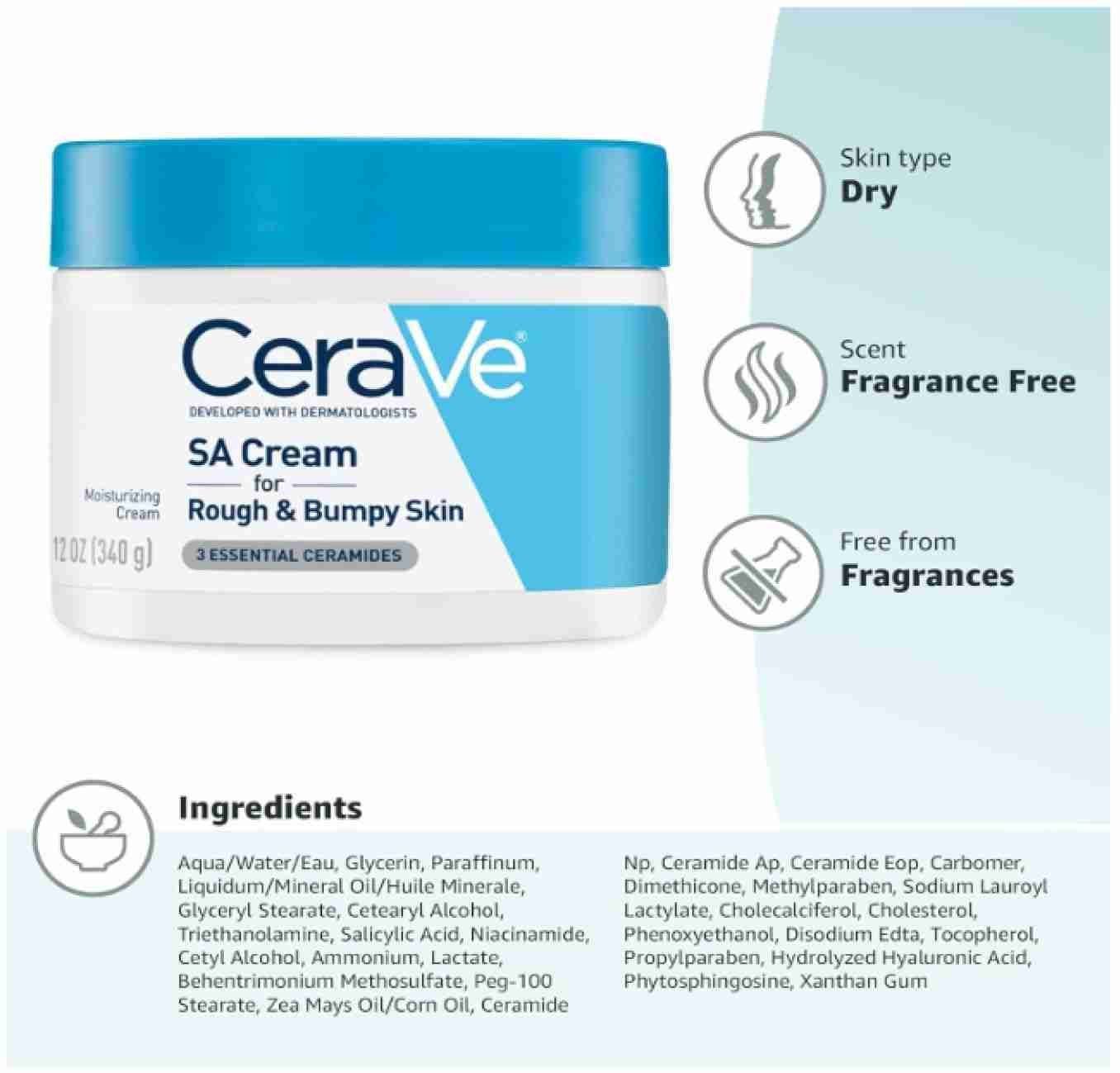 Developed with dermatologists, CeraVe Renewing SA Body Cream for Rough and Bumpy Skin, has a unique formula that exfoliates and moisturizes while helping to restore the protective skin barrier. Salicylic acid exfoliates and softens to smooth rough skin, lactic acid exfoliates to renew skin’s surface and three essential ceramides (1, 3, 6-II) help to restore the protective skin barrier.