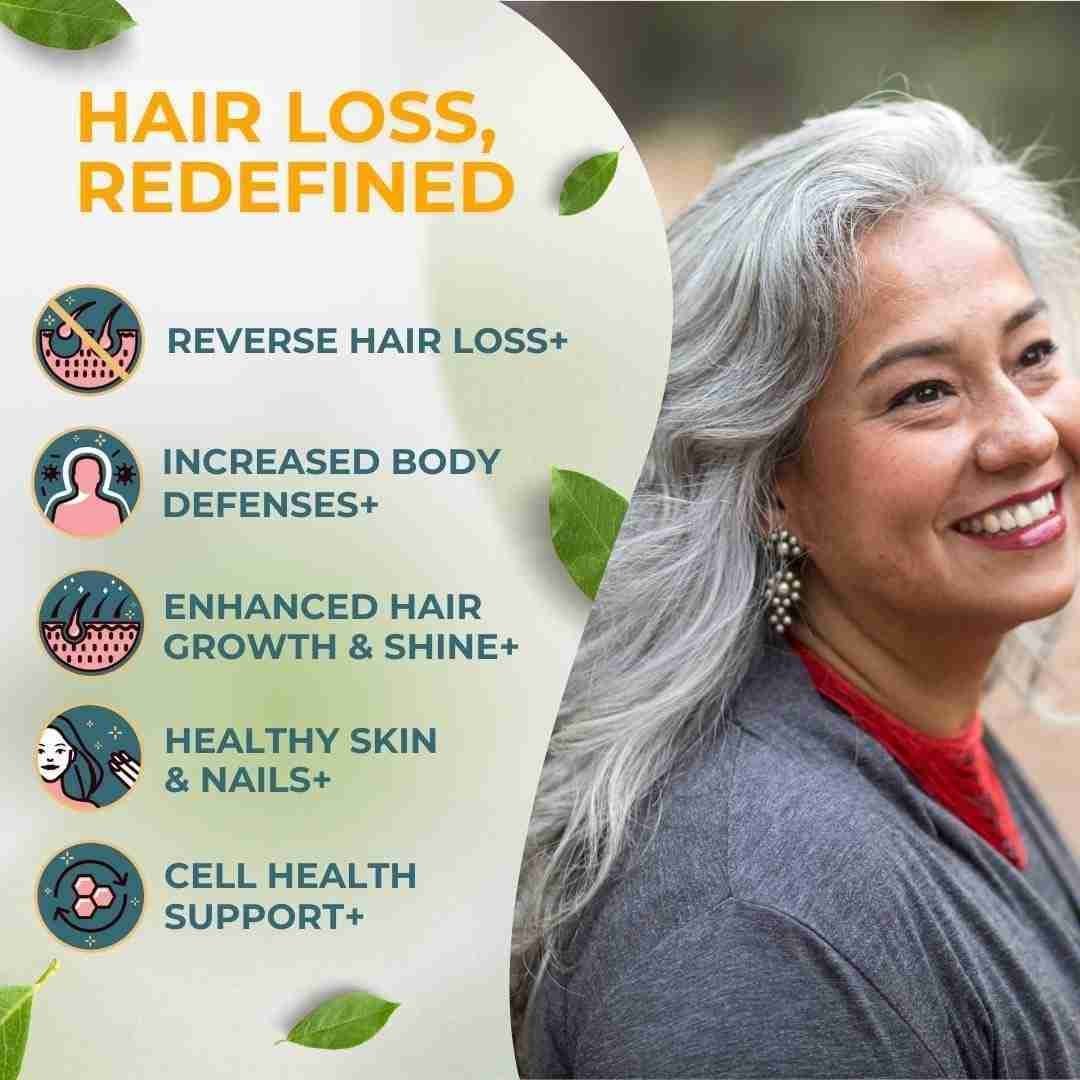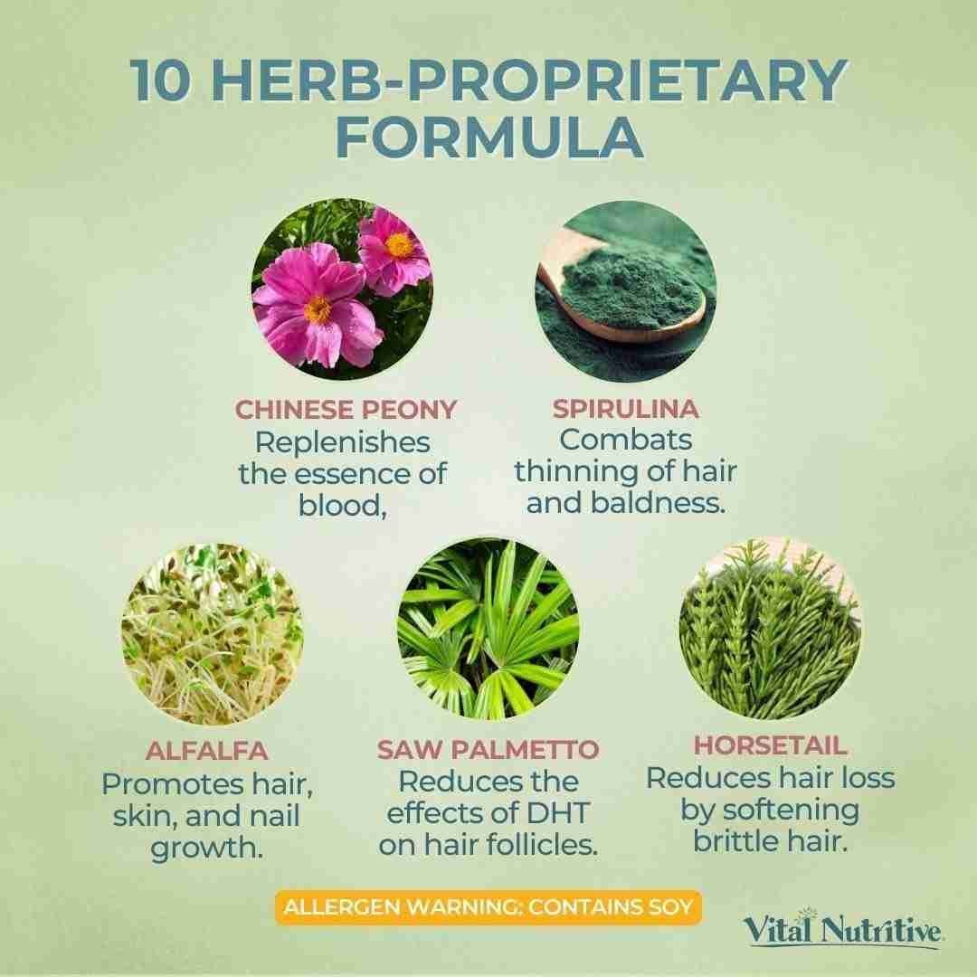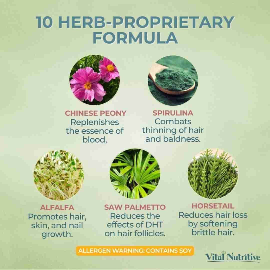 Our proprietary blend consists of 11 ingredients such as Horsetail Extract, Stinging Nettle, Chinese Peony, Spirulina, Saw Palmetto, and more, to generate hair strength and add sheen to its appearance.